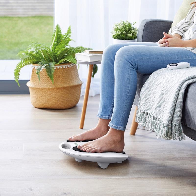 Consult your health professional before use. Sit down, place your bare feet on the foot-pads, and gradually increase intensity for optimal results.