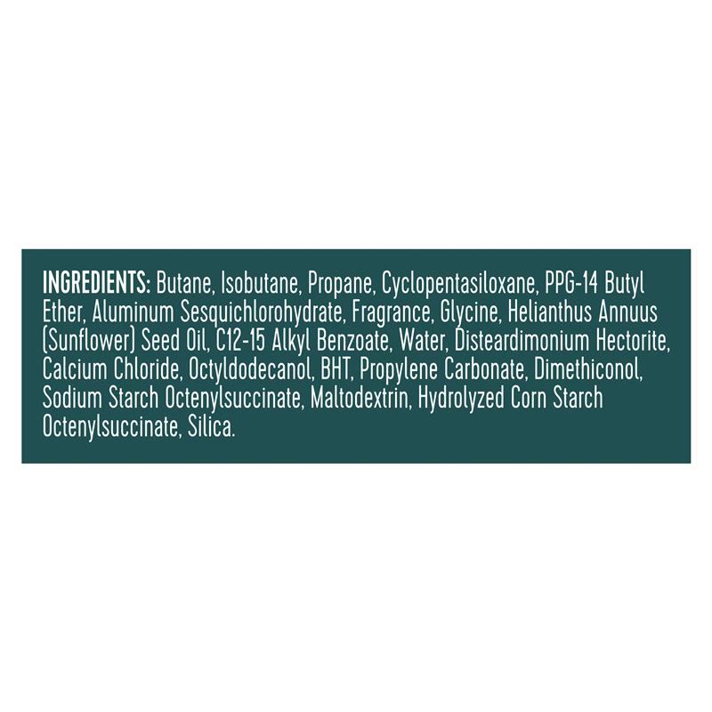 Butane, Isobutane, Propane, Cyclopentasiloxane, PPG-14 Butyl Ether, Aluminum Sesquichlorohydrate, Fragrance, Glycine, Helianthus Annuus (Sunflower) Seed Oil, C12-15 Alkyl Benzoate, Water, Disteardimonium Hectorite, Calcium Chloride, Octyldodecanol, BHT, Propylene Carbonate, Dimethiconol, Sodium Starch Octenylsuccinate, Maltodextrin, Hydrolyzed Corn Starch Octenylsuccinate, Silica.