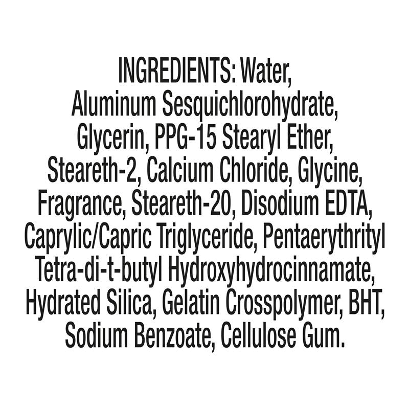 Water, Aluminum Sesquichlorohydrate, Glycerin, PPG-15 Stearyl Ether, Steareth-2, Calcium Chloride, Glycine, Fragrance, Steareth-20, Disodium EDTA, Caprylic/Capric Triglyceride, Pentaerythrityl Tetra-di-t-butyl Hydroxyhydrocinnamate, Hydrated Silica, Gelatin Crosspolymer, BHT, Sodium Benzoate, Cellulose Gum.