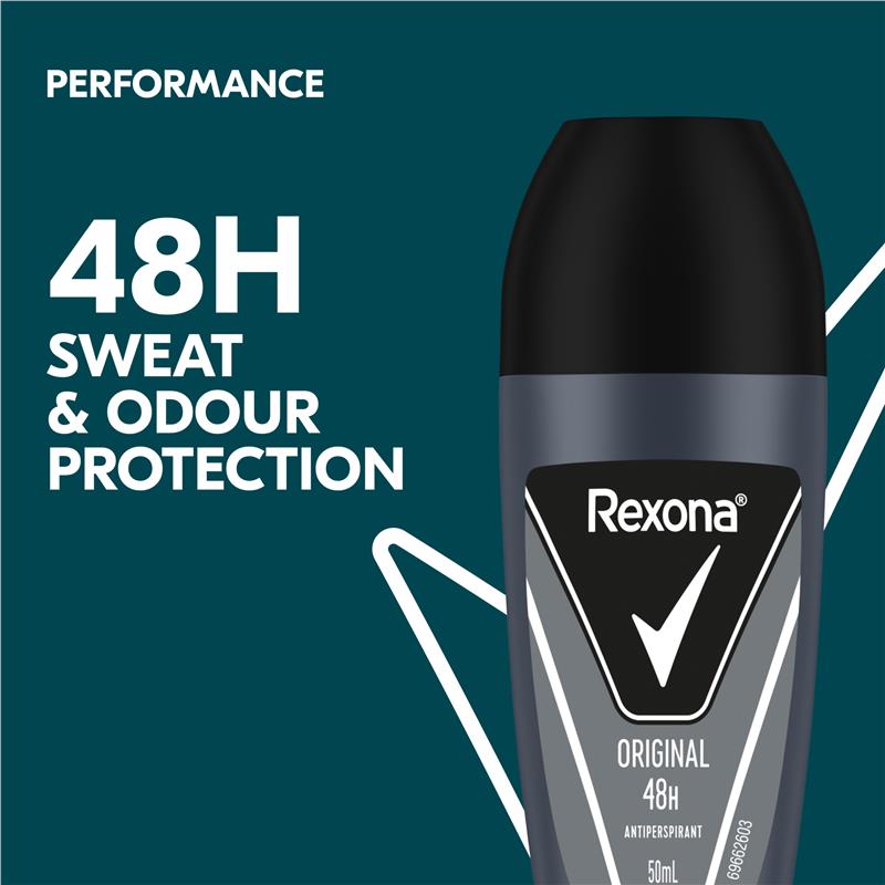 Rexona Men Original Antiperspirant Deodorant is a powerful, yet compact deodorant roll on that provides 48 hours of sweat and odour protection - giving you the confidence to start moving and take on the day. Featuring a classic fragrance with spicy and woody notes, our roll on deodorant keeps you feeling fresh, dry and clean all day long - so you're ready for whatever comes your way. In a convenient travel size, it's also perfect to take with you on the move. Simply roll on to clean, dry skin in circular motions, and you're good to go for the day. As part of our efforts to move together for a sustainable future, we're increasing our use of reusable materials and making it easier for you to recycle our packaging. Our Original roll on contains 34% less plastic than our previous men's roll on. Rexona was created in Australia more than 100 years ago, so it's fair to say we know a thing or two about sweat and odour protection. Rexona deodorants give you the confidence to move more and go further by giving you all the support and protection you need to break beyond your limits. When you work hard, Rexona works harder. Rexona, it won't let you down.