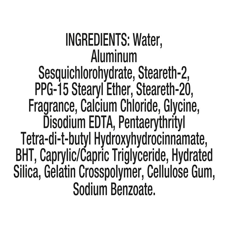 Water, Aluminum Sesquichlorohydrate, Steareth-2, PPG-15 Stearyl Ether, Steareth-20, Fragrance, Calcium Chloride, Glycine, Disodium EDTA, Pentaerythrityl Tetra-di-t-butyl Hydroxyhydrocinnamate, BHT, Caprylic/Capric Triglyceride, Hydrated Silica, Gelatin Crosspolymer, Cellulose Gum, Sodium Benzoate.