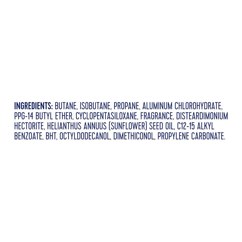 BUTANE, ISOBUTANE, PROPANE, ALUMINUM CHLOROHYDRATE, PPG-14 BUTYL ETHER, CYCLOPENTASILOXANE, FRAGRANCE, DISTEARDIMONIUM HECTORITE, HELIANTHUS ANNUUS (SUNFLOWER) SEED OIL, C12-15 ALKYL BENZOATE, BHT, OCTYLDODECANOL, DIMETHICONOL, PROPYLENE CARBONATE.