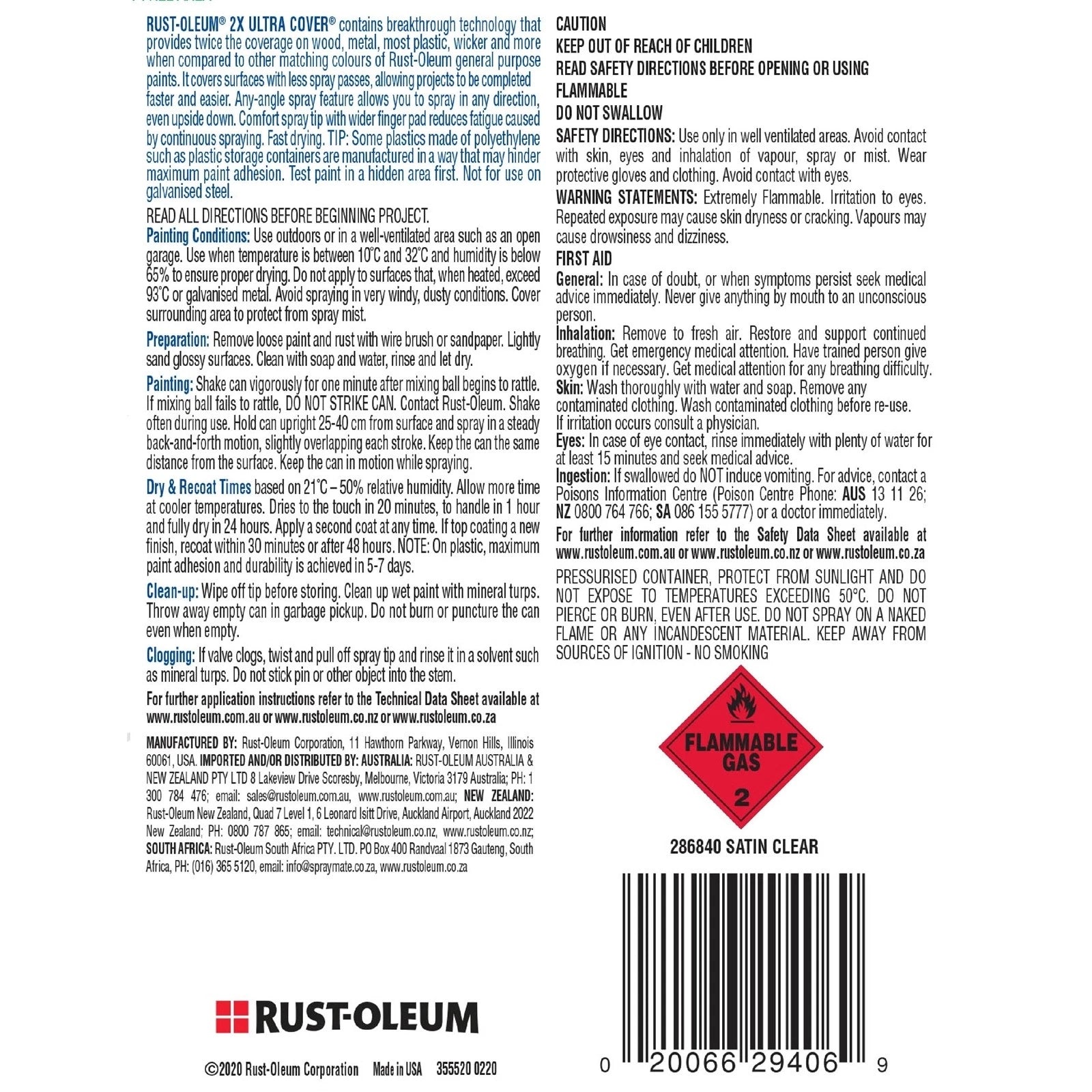 Includes 1 x Rust-Oleum 298g 2X Ultra Cover Satin Clear Spray Paint.