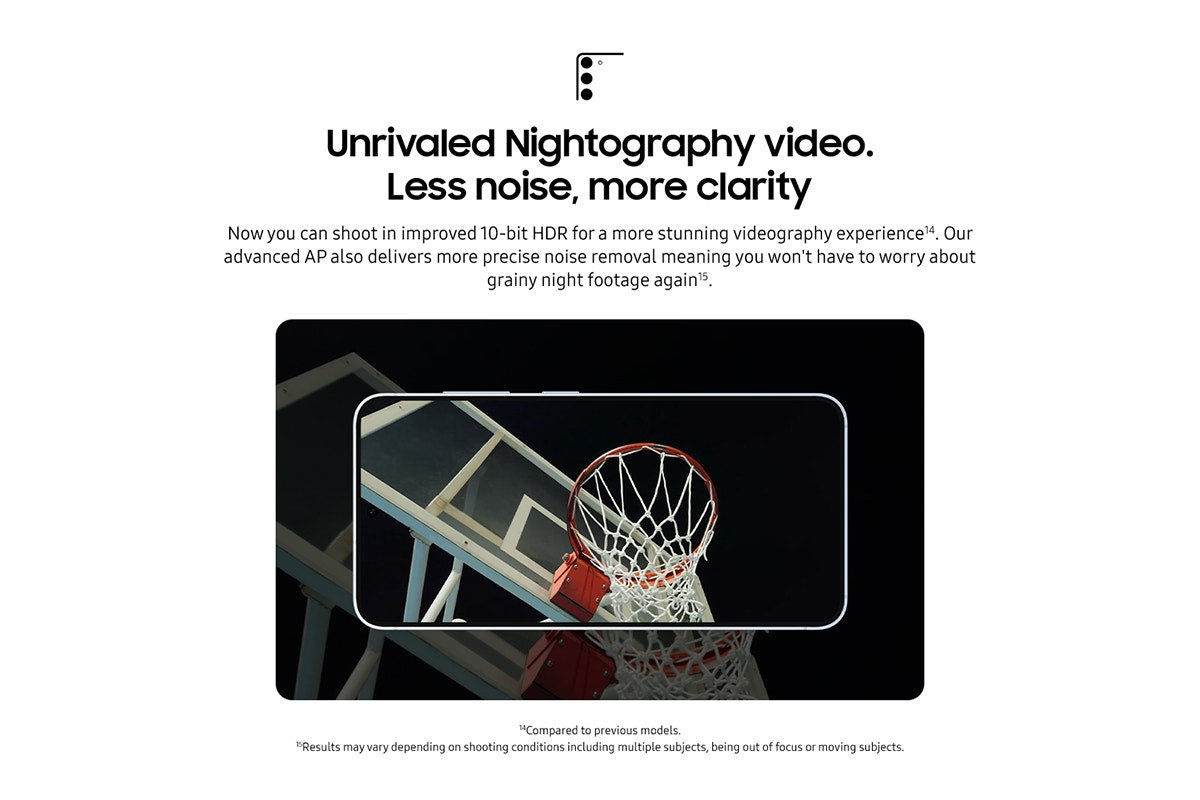 Capture stunning videos in improved 10-bit HDR for a richer, more vibrant experience. With Samsung’s advanced AP, enjoy more precise noise removal, ensuring crystal-clear night footage without the grain.