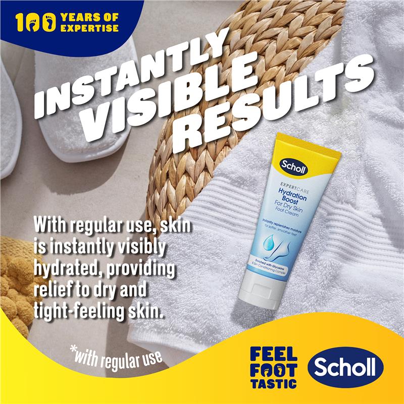Scholl Expertcare Hydration Boost foot cream for dry skin.Instantly replenishes moisture for softer, smoother feet.Specifically developed for the skin on your feet. Enriched with glycerine and skin-conditioning complex. It delivers targeted moisturization to the thicker layers of the skin. Product size: 75 ml.