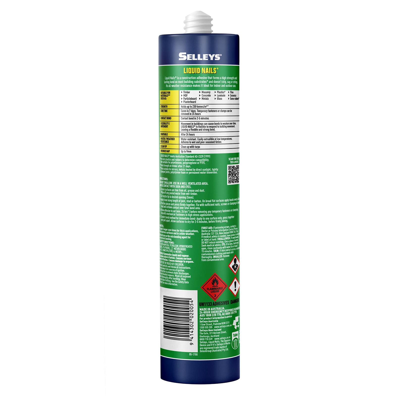 Includes 1 x 320g bottle of Selleys Liquid Nails Construction Adhesive.
