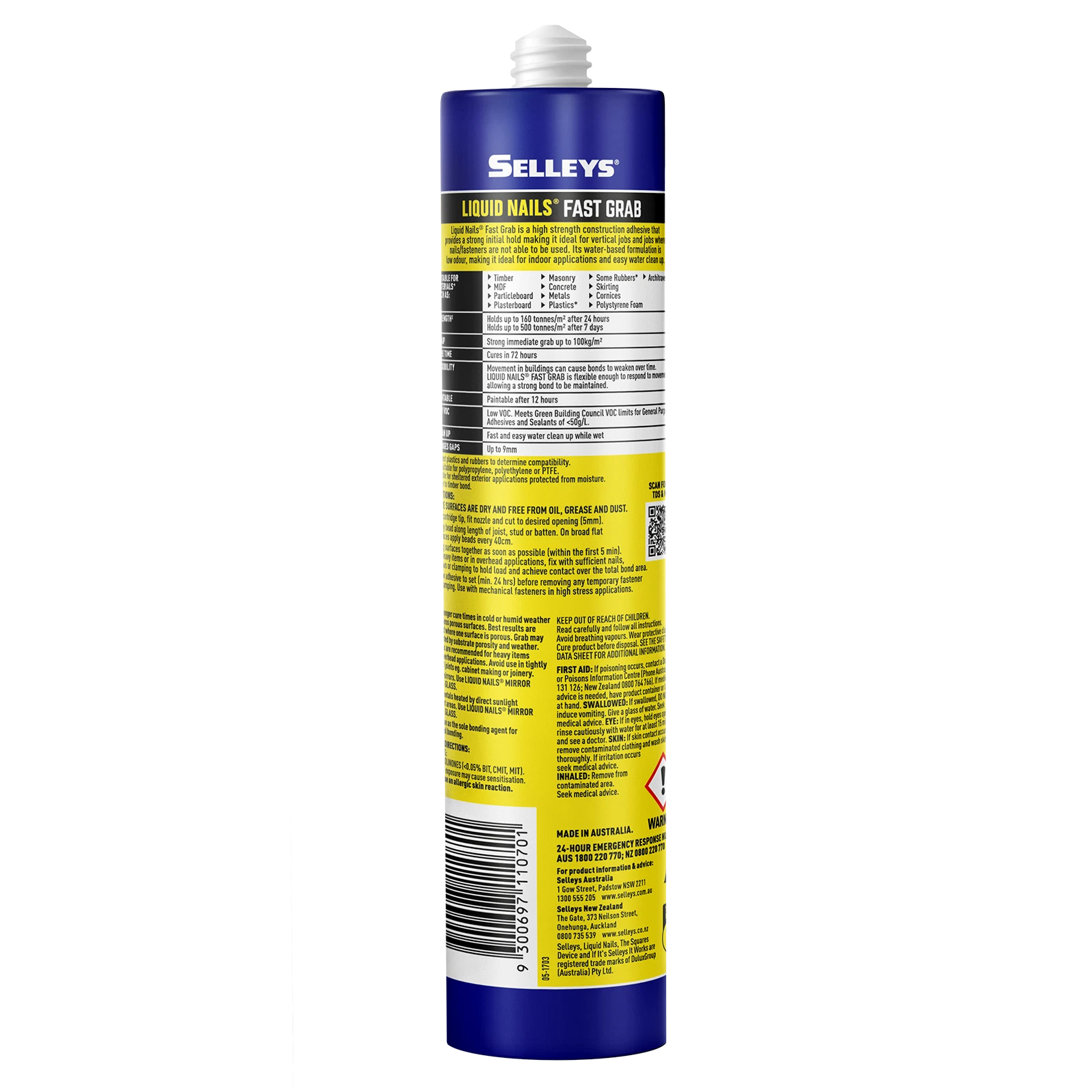 Includes 1 x 420g bottle of Selleys Liquid Nails Fast Grab Strong Adhesive.