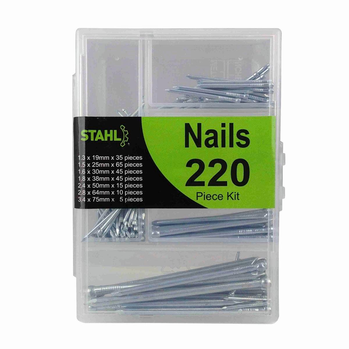Stahl Handy Kit Nail Set - 220 Pce - Carbon Steel - Easy Storage offers a comprehensive range of nails for various home projects, ensuring you have the right fastening solution at hand.