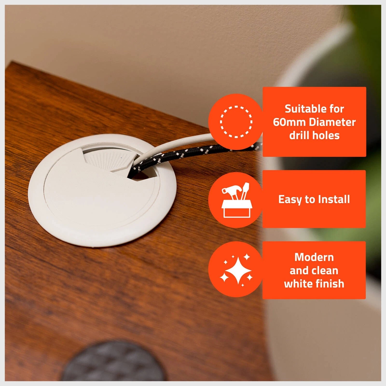 Organise your cables efficiently with the Taskmaster 60mm White Cable Duct. Perfect for home or office use, this pack provides a simple solution for managing cables through desktops and other surfaces. Designed for easy installation, these cable ducts help keep your workspace tidy and clutter-free.