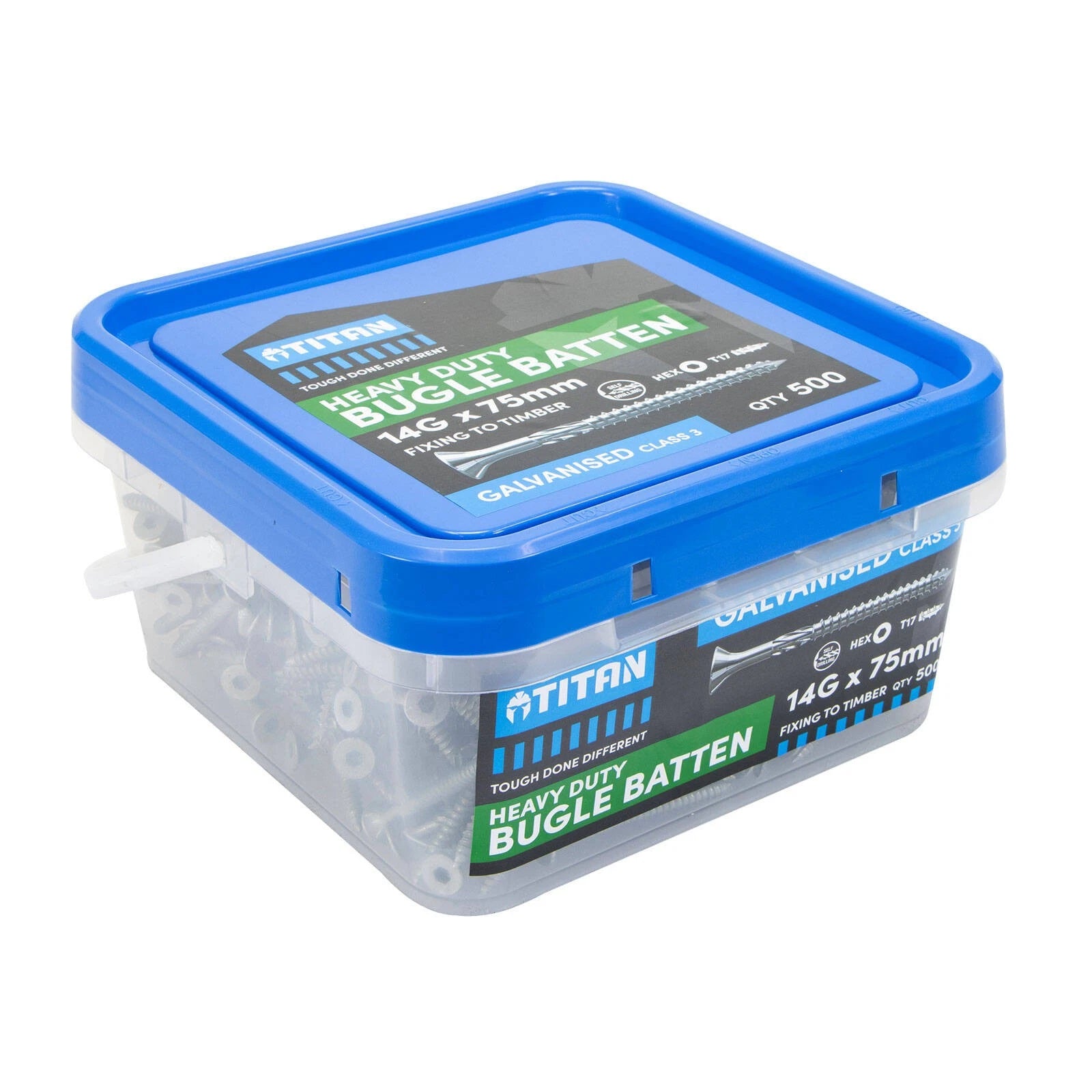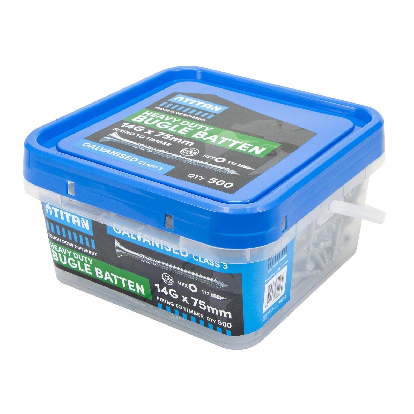 Discover the reliable and durable Titan 14G x 75mm CL3 Galvanised Bugle Batten Screw, perfect for a wide range of outdoor and construction projects. Designed for strength and ease of use, this heavy-duty screw is ideal for securing battens, fencing, furniture, and more.