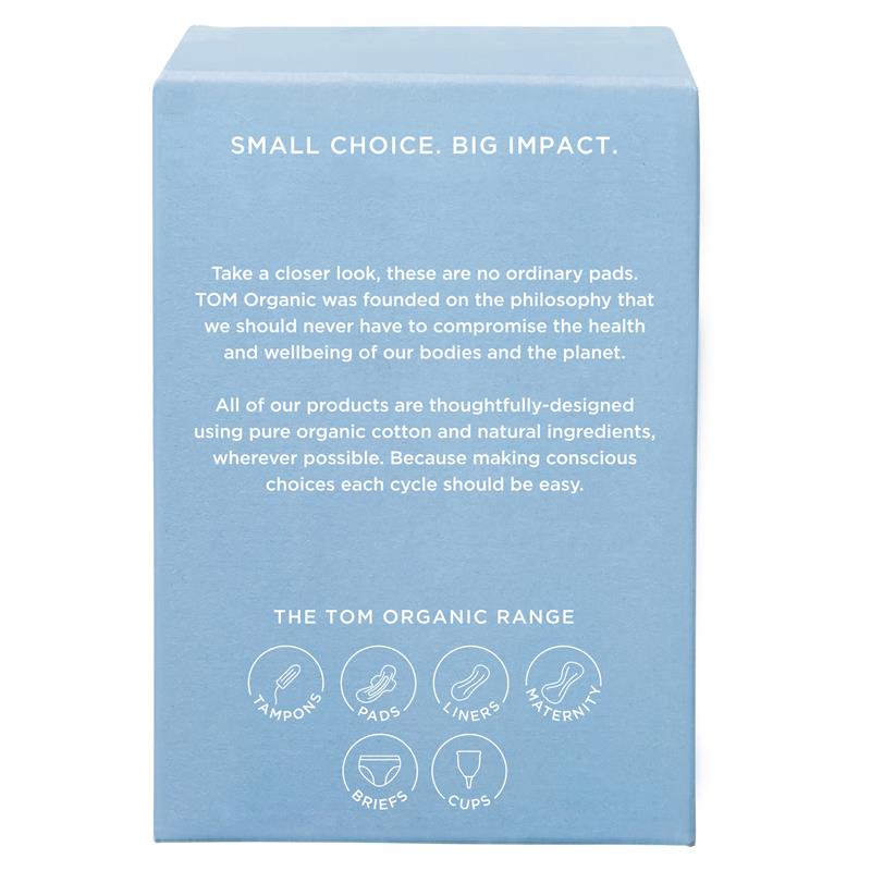 Discover the essence of mindful menstruation with TOM Organic Super Pads. Made from 100% organic cotton topsheet, these ultra-thin, biodegradable materials pads are perfect for women and teens seeking a harmonious balance between comfort and sustainability. Ideal for heavy flow, they provide reliable protection without harsh chemicals. Clinically tested for sensitive skin, our pads are hypoallergenic and free from chlorine bleach, dioxins, fragrances and dyes, ensuring your health and well-being are never compromised. Our unique design features wings for a secure fit and a plant-based core for exceptional absorbency, ensuring you stay confident and comfortable. When you choose TOM Organic, you're not just buying periodwear, you're becoming part of a movement towards conscious living and menstrual care that respects both your body and the environment. Our TOM Organic Super Pads are carefully packaged in recyclable cardboard, with individual wrappers made from siliconised PE film and bio-plastic. This sustainable approach minimises the impact on the environment and ensures that our packaging is as conscious and eco-friendly as the pads themselves. Small Choice. Big Impact.