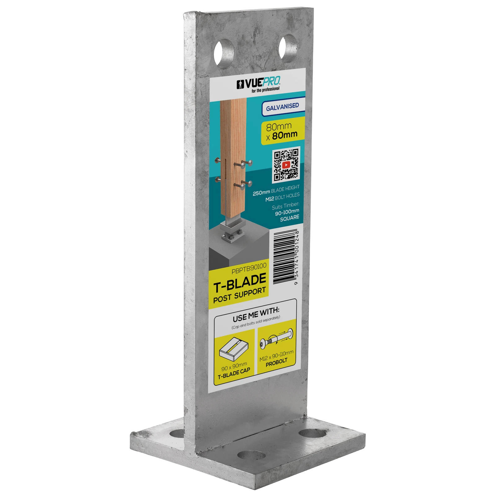 Enhance your decorative timber installations with the VUEPRO 80 x 80mm Galvanised T-Blade Post Support. Designed for secure, concealed fixing of large timber posts onto concrete surfaces, this robust bracket offers a clean and professional finish for your project.