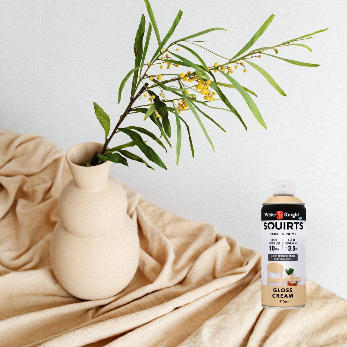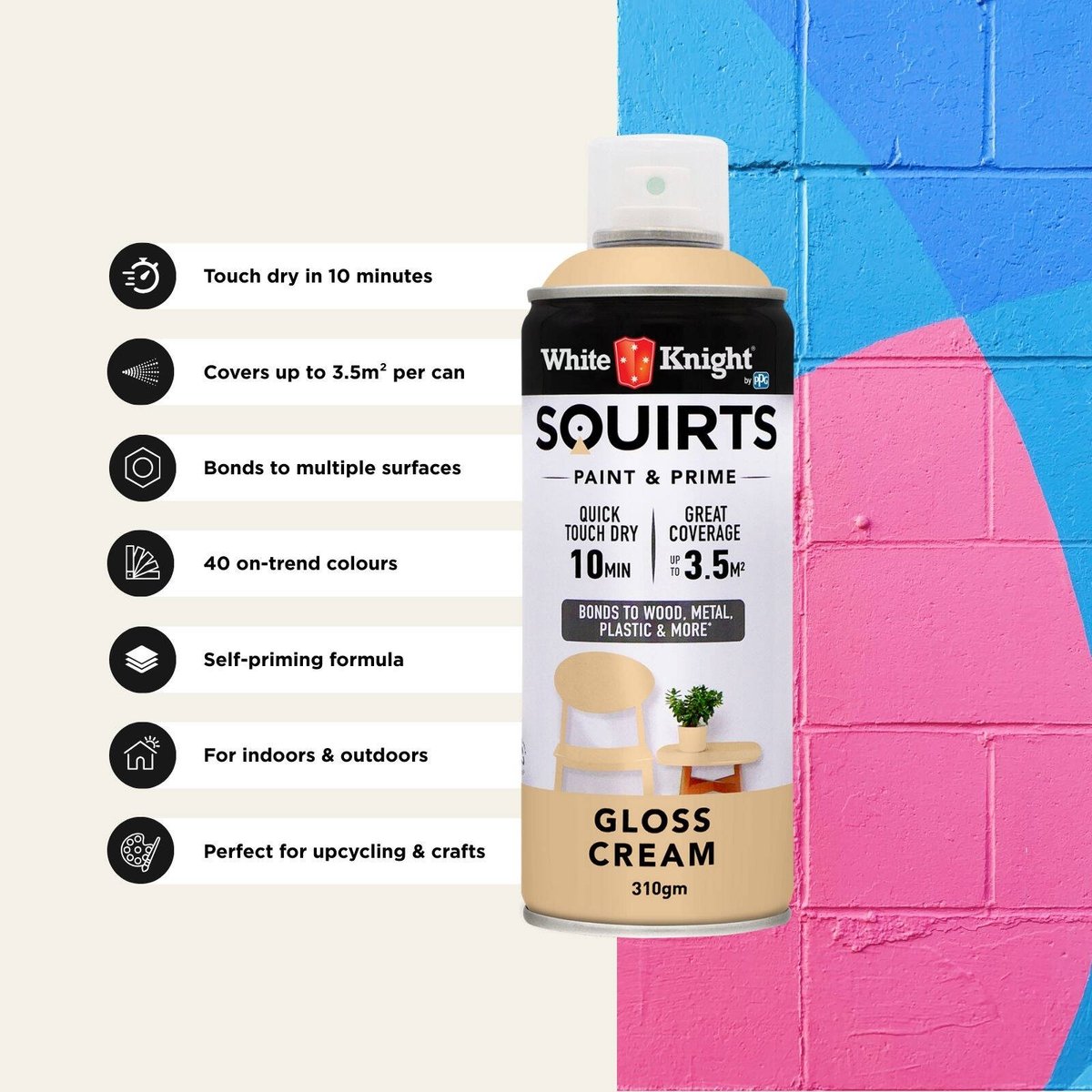 White Knight Squirts Cream Gloss Spray Paint 310g is a quick-dry, durable spray paint ideal for various surfaces, providing excellent coverage and a high-shine finish.