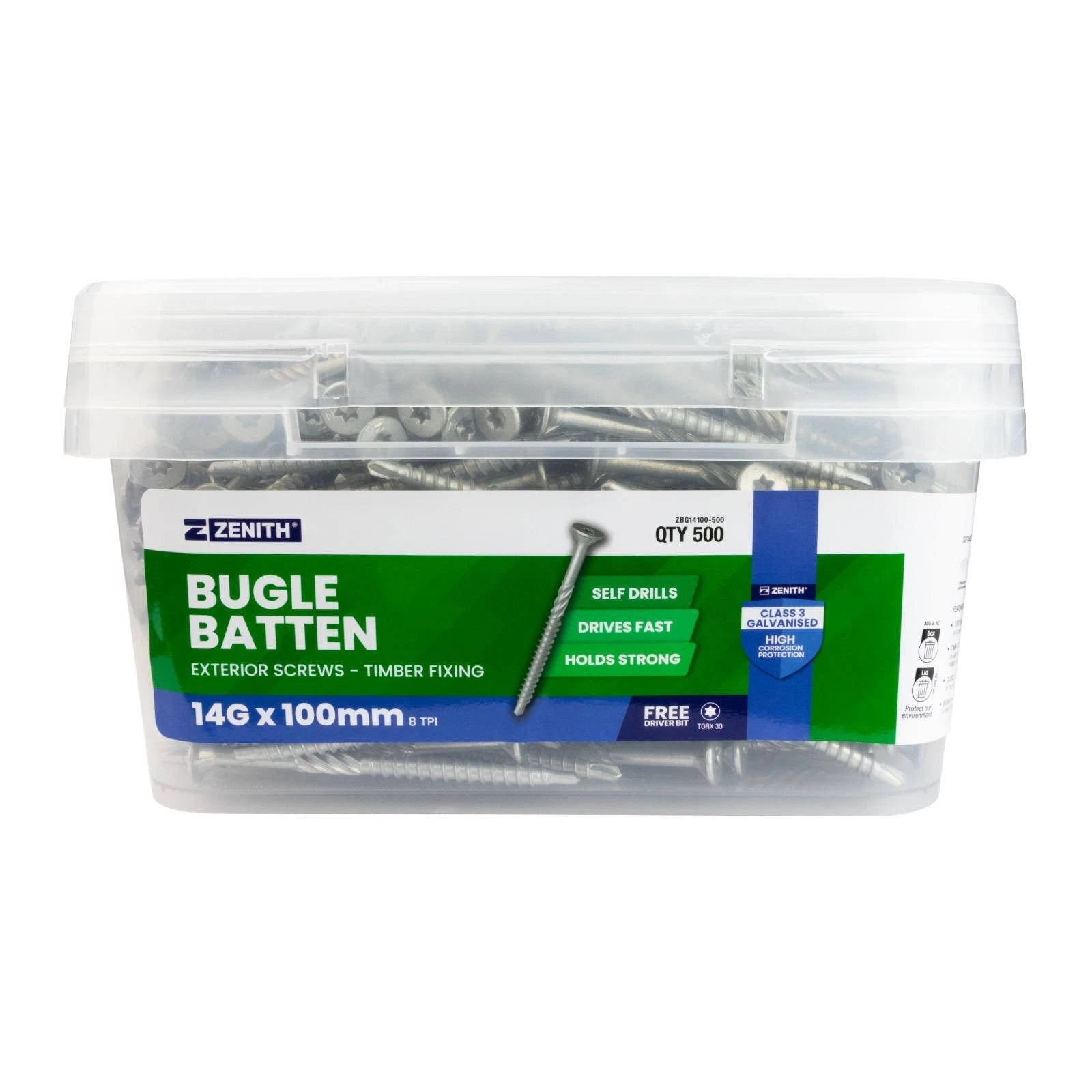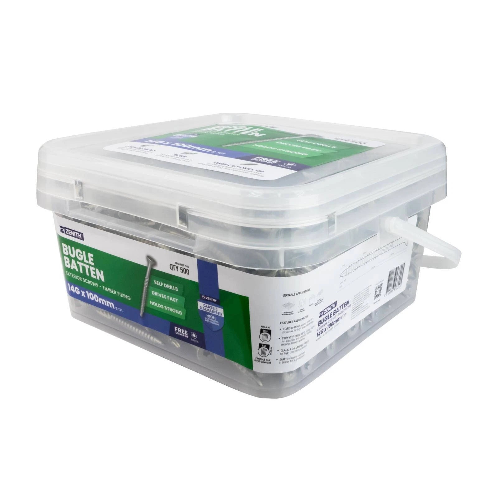 Discover the reliable and durable ZENITH 14G Bugle Batten Screws, designed for heavy-duty timber applications. These high-quality screws feature a self-drilling tip and a corrosion-resistant galvanised finish, making them ideal for outdoor projects such as fencing, decking, and structural framing. With a secure fit and minimal timber splitting, they ensure a professional finish every time.