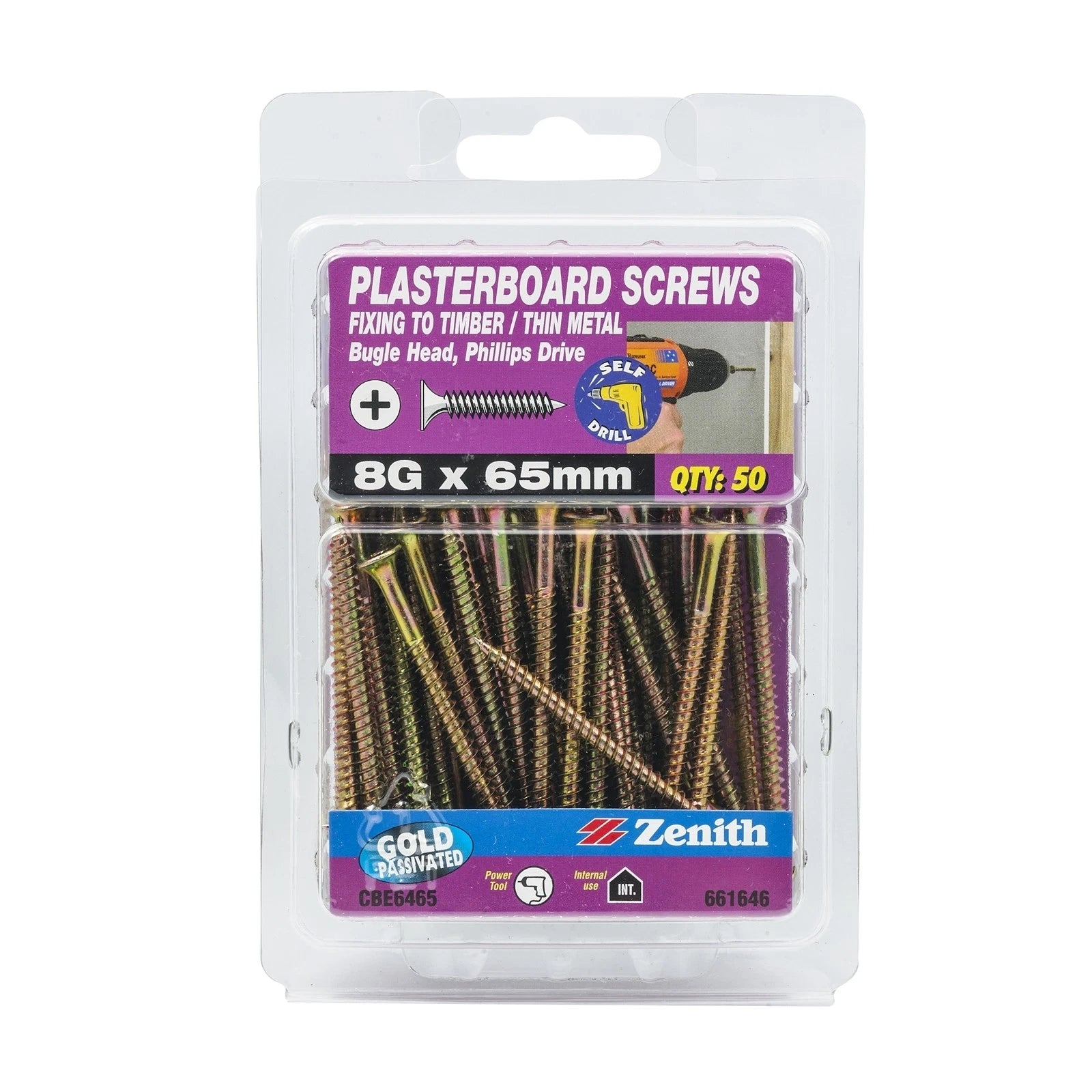 Includes 50 Zenith 8G x 65mm Gold Passivated Bugle Head Plasterboard Screws in a convenient snap pack.