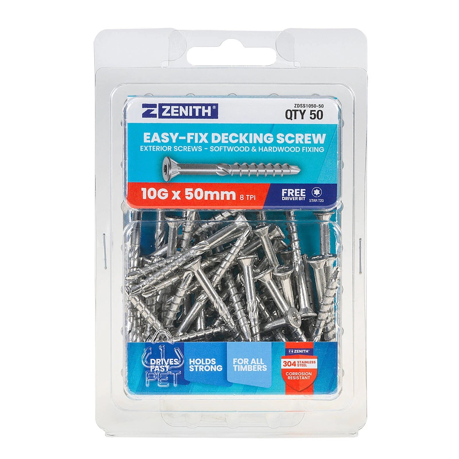 Includes 50 Zenith Easy-Fix Decking Screws T20 10G x 50mm SS304.