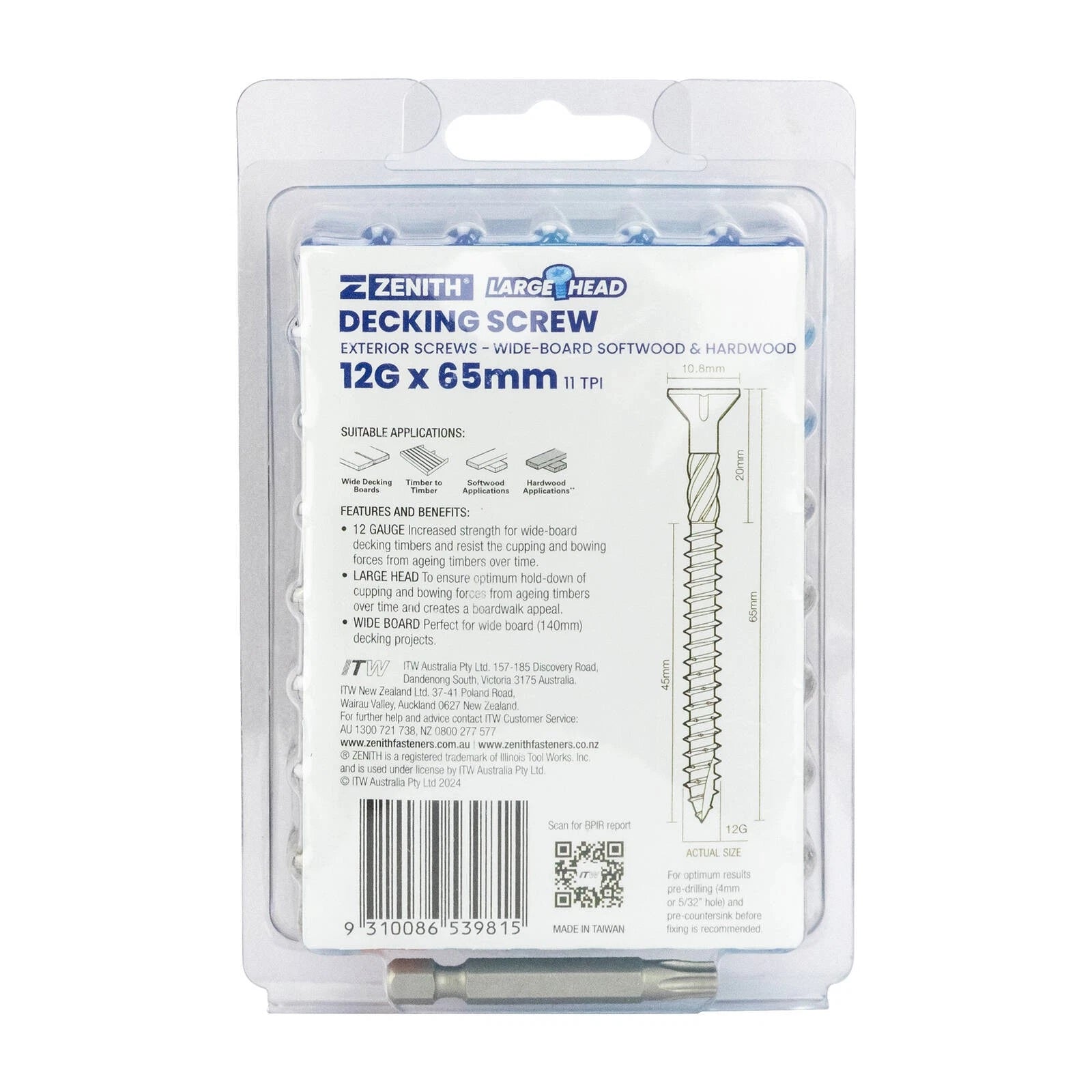 Upgrade your decking projects with the Zenith Large Head Decking Screw, designed specifically for wide board applications. Crafted from durable stainless steel, these screws provide superior strength and a professional finish for your outdoor decking. Perfect for wide boards up to 140mm, ensuring secure and long-lasting results.
