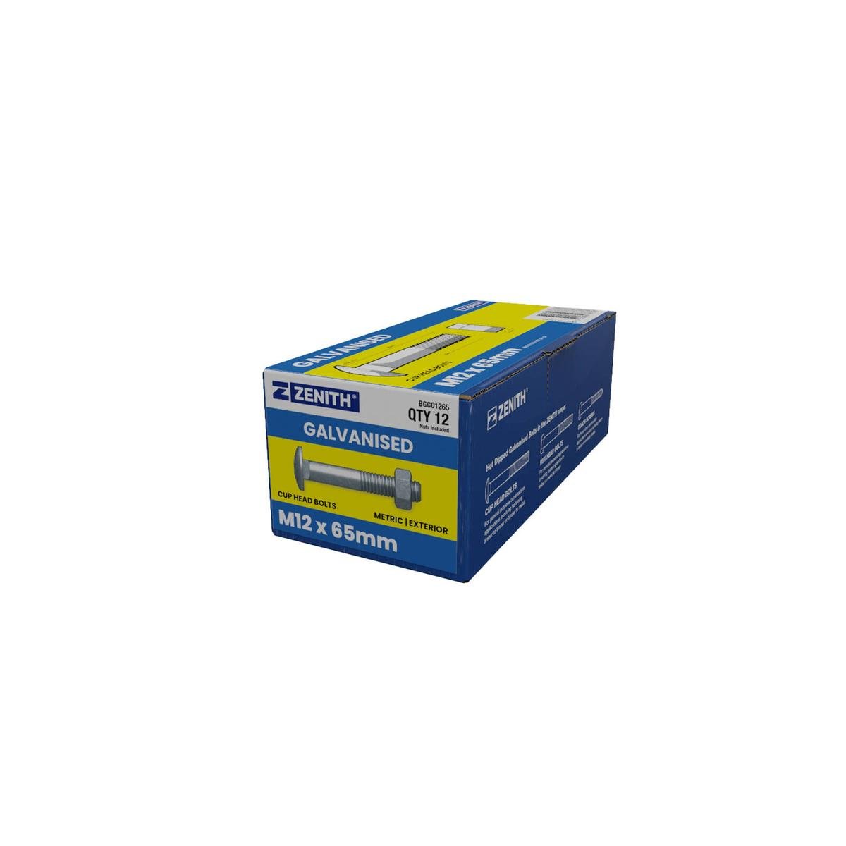 Zenith M12 x 65mm Hot Dip Galvanised Cup Head Bolts Nuts 12 Pack offers a reliable fastening solution for various construction applications with a low profile design.